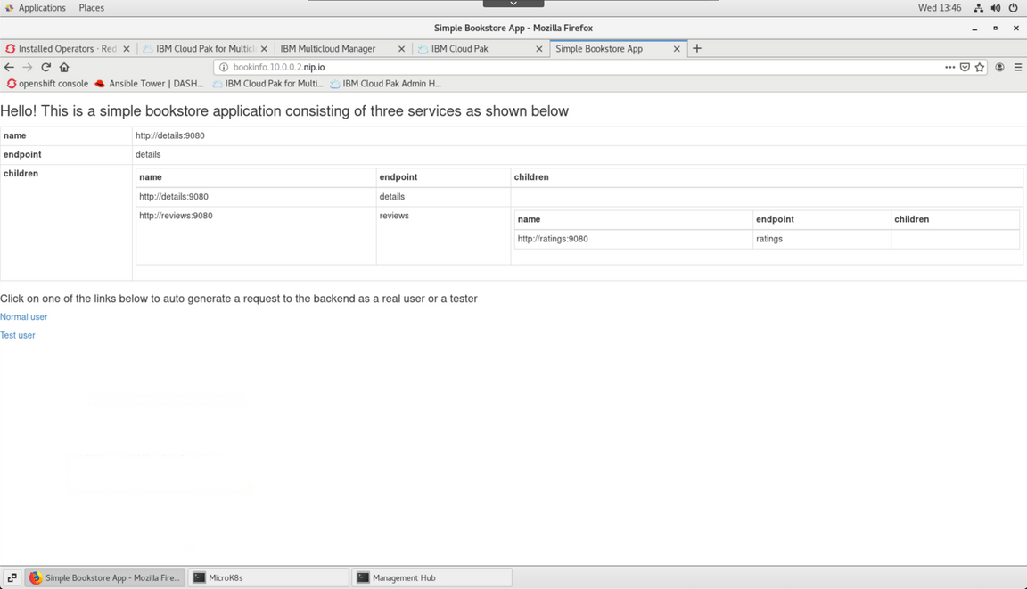 /home/ibmuser/oclogin.shoc apply -f bookinfo-multiclister-2020.2.1oc apply -f kubernetes-1.18-ingress-deployable.yamlIf you happen to run Kubernetes 1.19 on the your managed cluster (outside the Skytap environment) use kubernetes-1.19-ingress-deployable.yaml. Ingress API was changed in 1.19 and extended with new mandatory fields