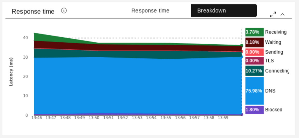 You can adjust the scope of the timeline, reducing the windows to last 30 minutes (1). You can also select to see a Response time graph or a response time Breakdown (2). This helps to diagnose issues related to name resolution on establishing the SSL session.