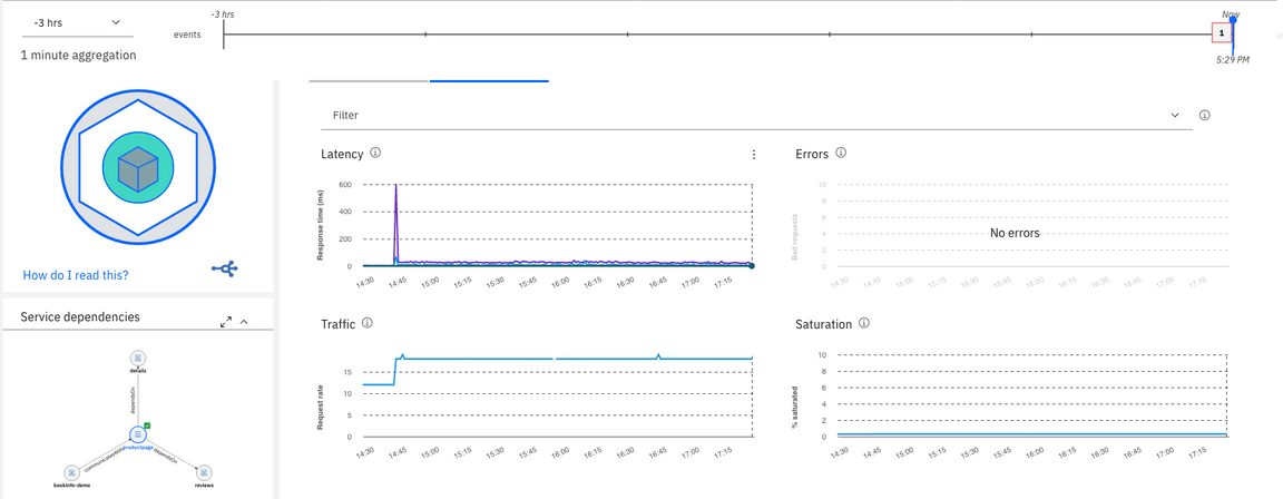 Click on “reviews” icon. You will navigate to that microservice and see the 1-hop topology for the “review” service. Examine the golden signals for the “reviews” service.